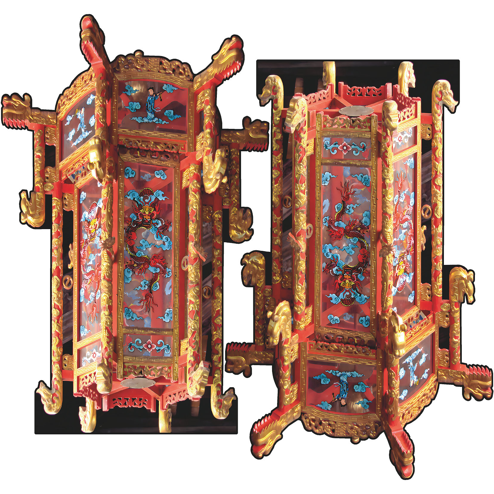 By Jean-Pierre Dalbéra from Paris, France - Lanterne dans le pavillon des âmes célèbres (Cité impériale, Hué), CC BY 2.0, 40x25 inch cardboard cutout of a Japanese hanging lantern with a red and gold dragon design. These lanterns are a Chinese originated lantern design which are typically small six or four sided wood or metal frames and initially used in Imperial palaces.
