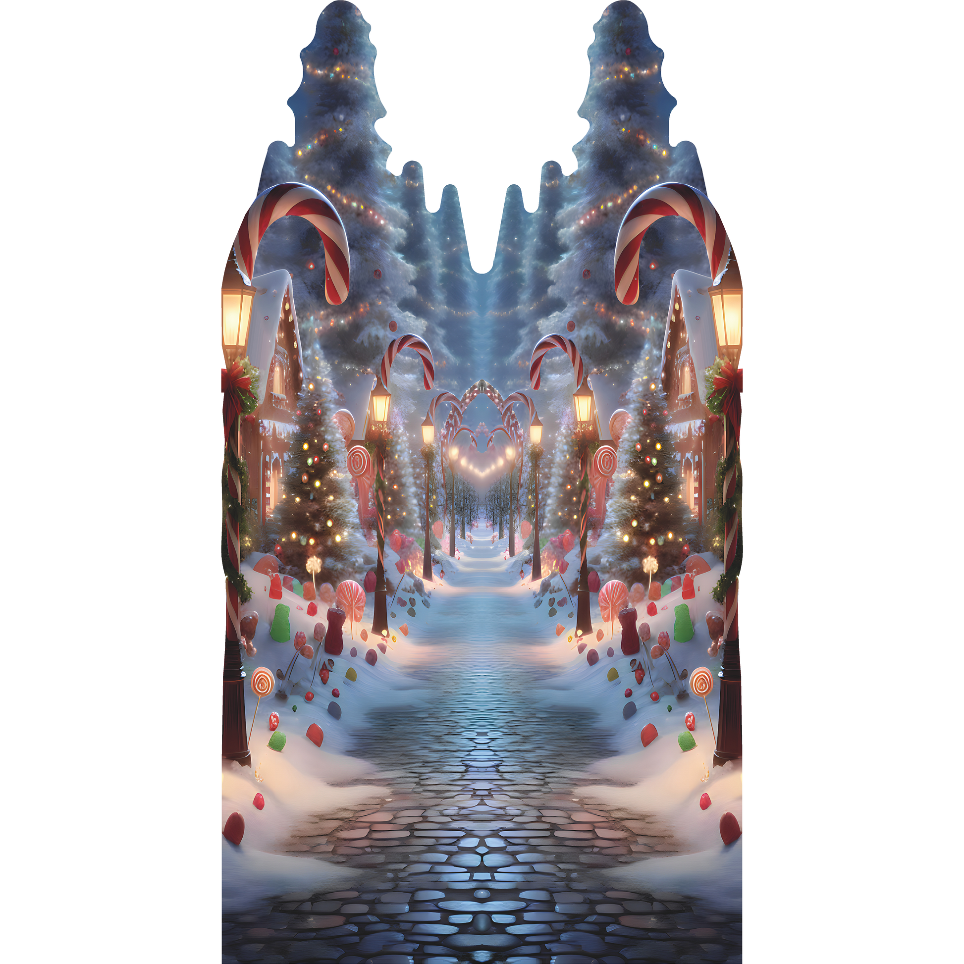 85x46 inch cardboard cutout of Candy Cane Lane! Visit the friendly neighborhood elves at their gingerbread houses and share hot cocoa and warm memories this Christmas season!