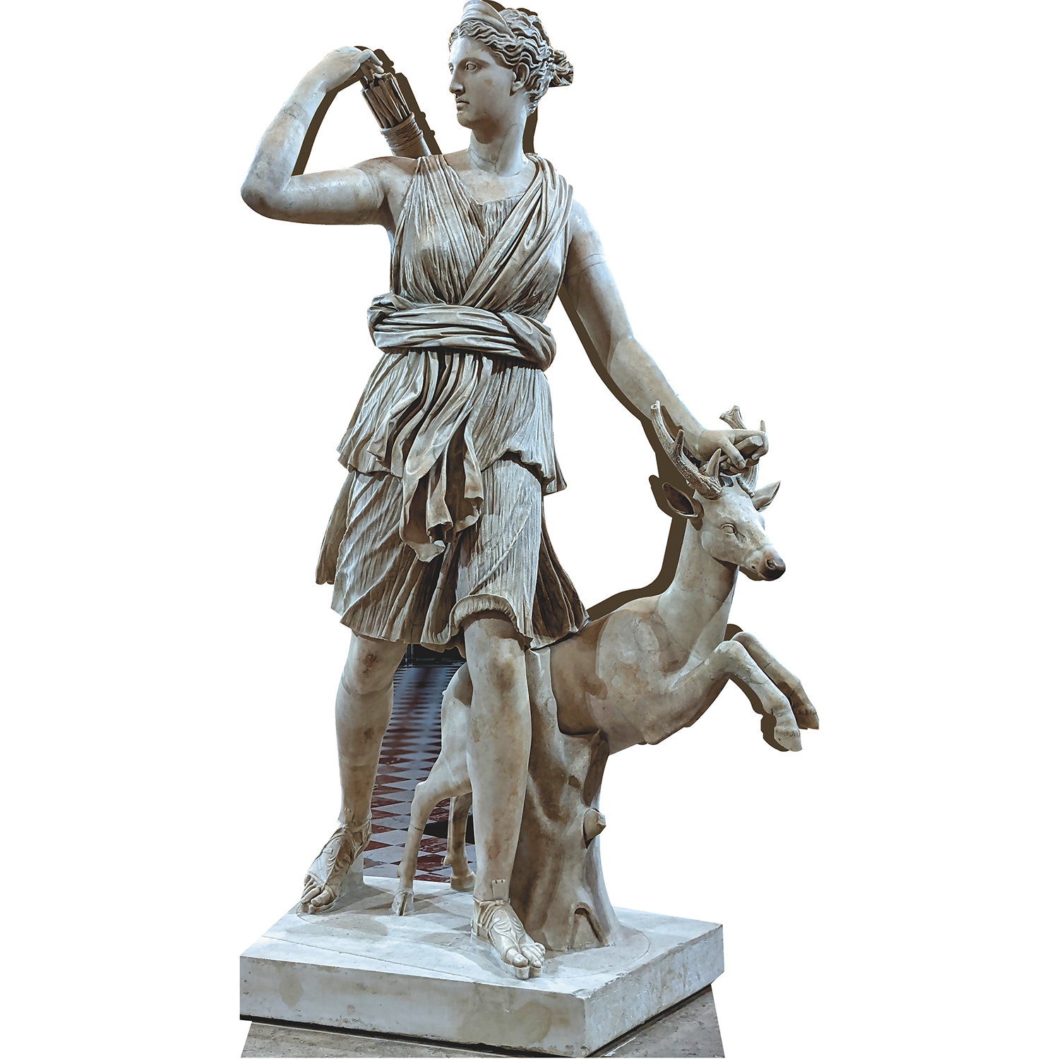 84x46 inch cardboard cutout of Diane de Versailles. Pope Paul IV has given Henry II of France the statue in 1556 as an allusion to his mistress Diane de Poitiers. There have been a few replicas made throughout the year, including one that was on board the famous Titanic. In 1986, it was discovered on the sea floor near the wreck, photographed, but its location has never been marked. In 2024, the statue was found and photographed again..