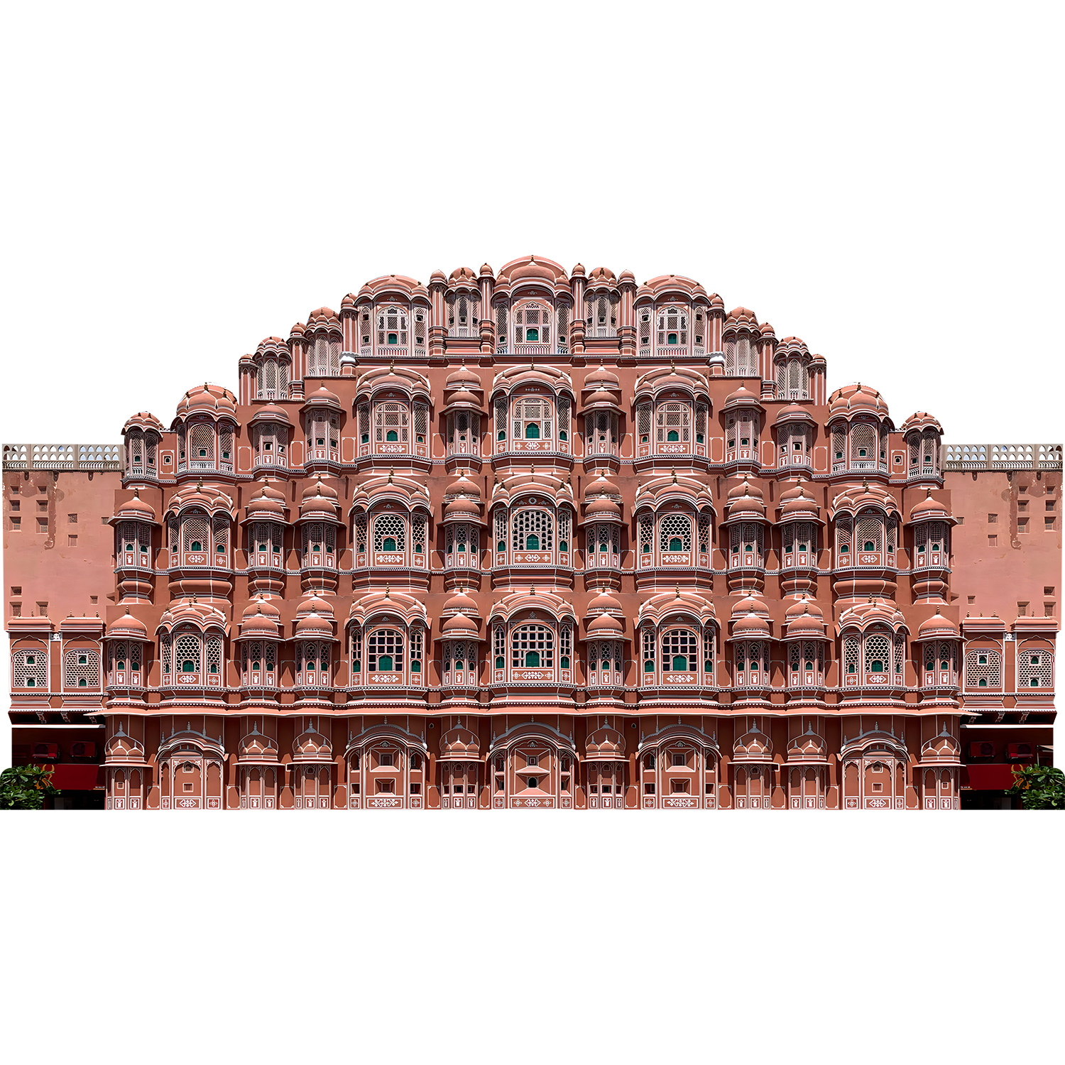 By Chainwit. - Own work, CC BY-SA 4.0, 90x46 inch cardboard cutout of Hawa Mahal in India. This pink and red sandstone palace is unique in having many balconies and small windows that resemble a honeycomb. Famously, the building is known as the palace of winds.