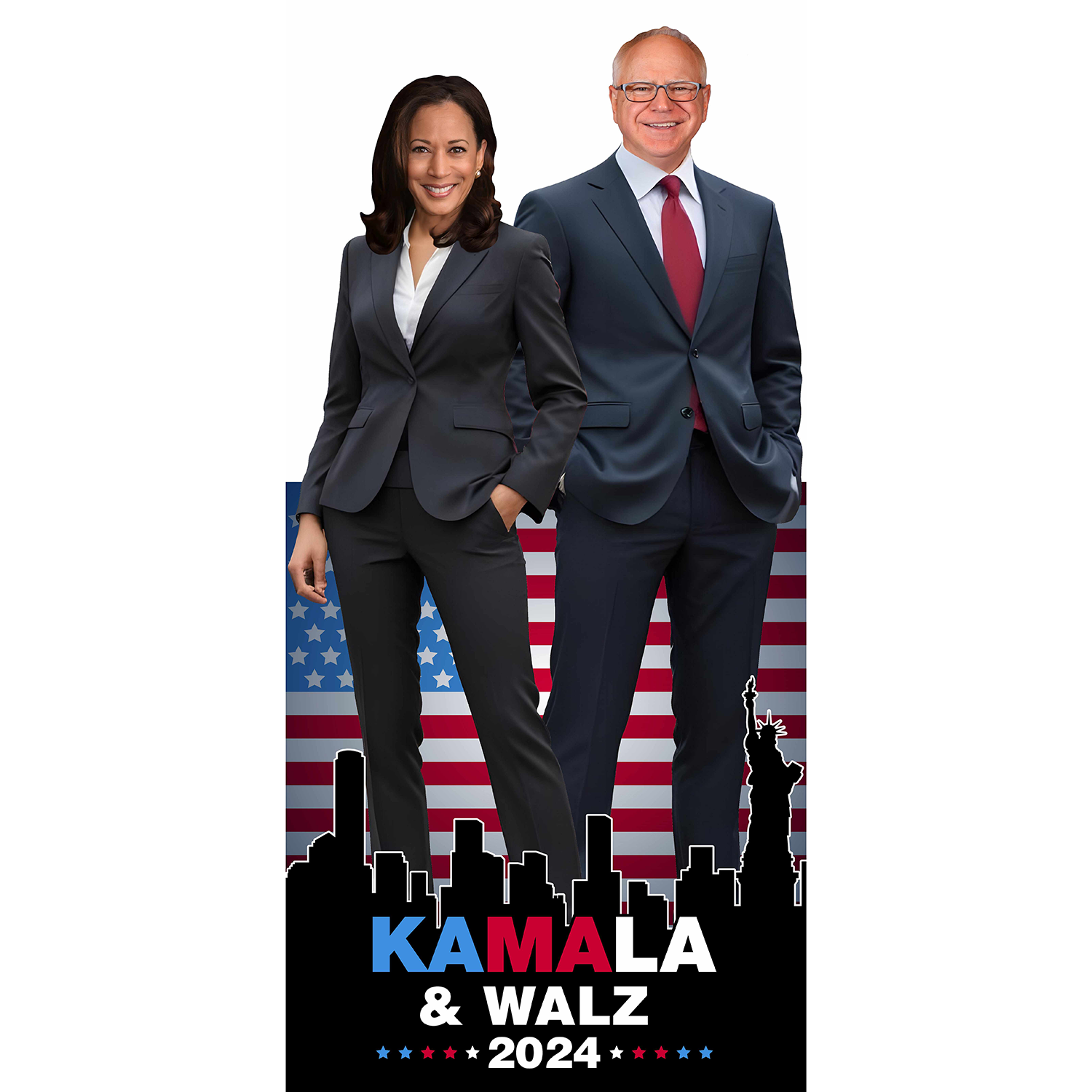 Kamala Harris and Tim Walz represent a dynamic partnership ready to shape the future of America, and what better way to capture this historic duo than with our lifesize custom cutout backdrop? Vice President Kamala Harris, the first woman, the first Black, and the first South Asian American to hold the office, has consistently shattered glass ceilings and paved the way for inclusivity and equality. Known for her sharp intellect, passionate advocacy for justice, and commitment to representing the underrepresented, Harris brings a wealth of experience and a steadfast vision for the future of the United States.