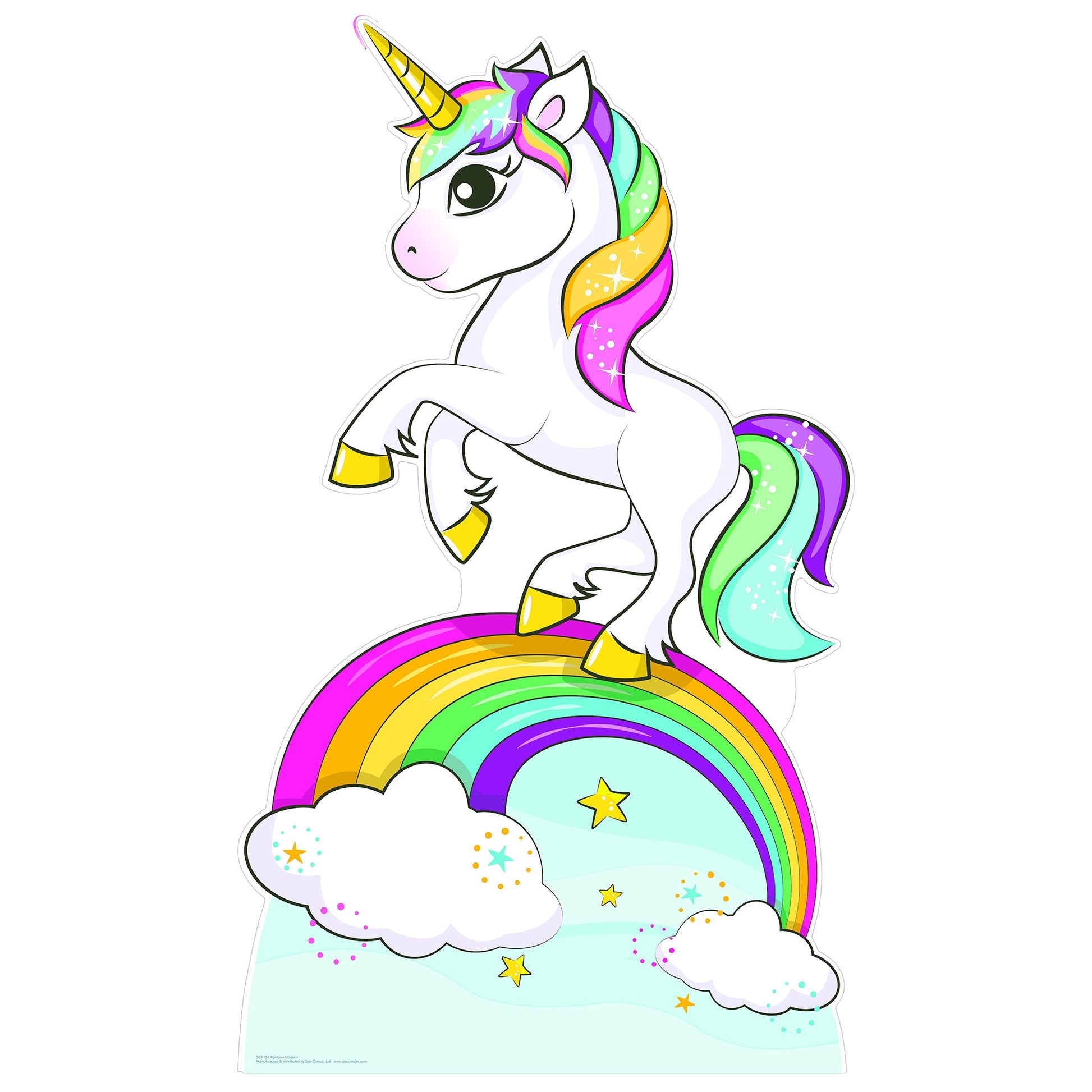 Step into a world of magic and whimsy with our Rainbow Unicorn Cardboard Cutout. This enchanting creation captures the ethereal beauty and boundless imagination that the mythical unicorn symbolizes, bringing a spark of joy and fantasy to any environment. Imagine the delight on children's faces at birthday parties, the whimsical charm it adds to festivals, or the playful backdrop it provides in classrooms and playrooms. Standing at a lifelike size, this Rainbow Unicorn Cardboard Cutout is meticulously designed with vibrant hues and intricate details to evoke a sense of wonderment. Whether you're a fan of mythical creatures or simply looking to add a splash of color and creativity to your space, this unicorn cutout promises to be a magical addition. Easy to set up and made from durable materials, it's sure to be a memorable centerpiece for any gathering or a charming companion in everyday decor. Embrace the fantasy and let the Rainbow Unicorn take you on an unforgettable journey beyond the clouds.