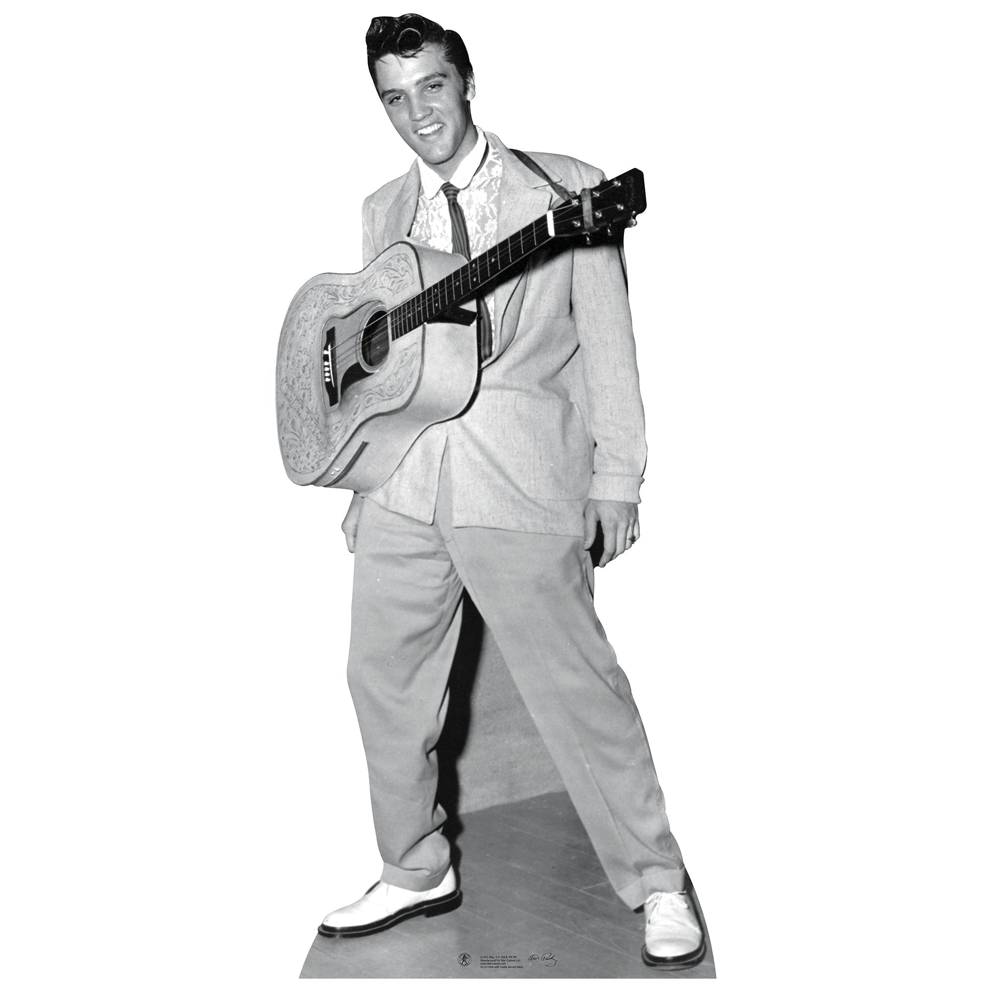 Elvis Presley, known as the "King of Rock 'n' Roll," remains an enduring icon whose influence on music and culture is immeasurable. With his signature voice, charismatic presence, and pioneering blend of various musical genres, Elvis captivated audiences worldwide. This lifesize cardboard cutout captures the legendary moment that characterizes much of his performing life—Elvis with his guitar around his neck, ready to electrify the stage.